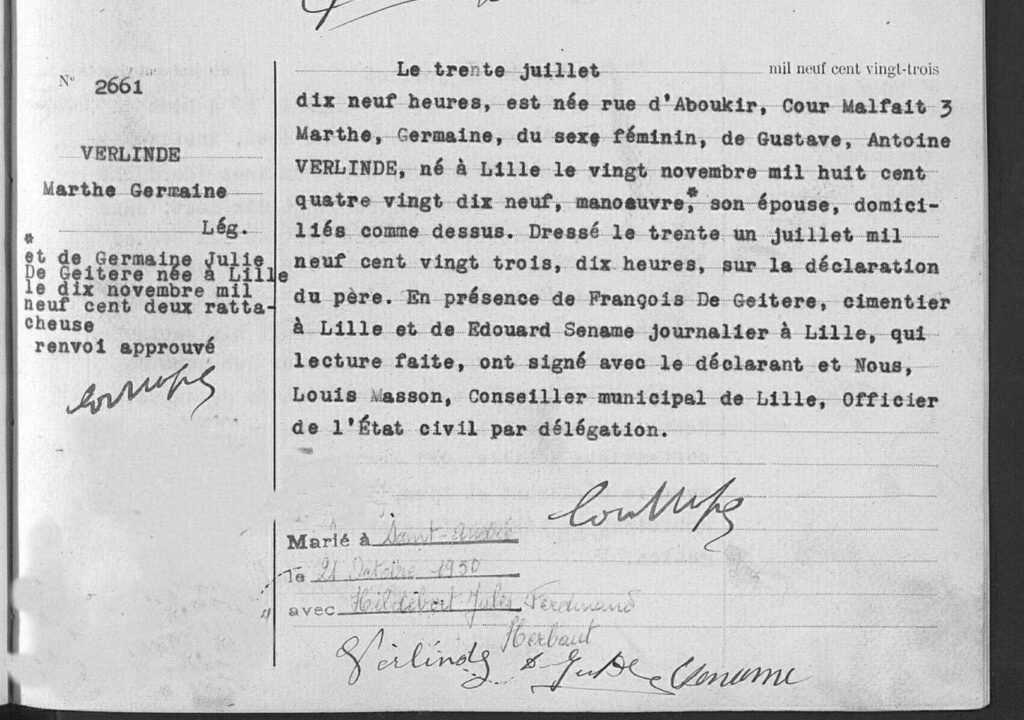 Marthe Germaine VERLINDE est née à Lille, le 30 juillet 1923.