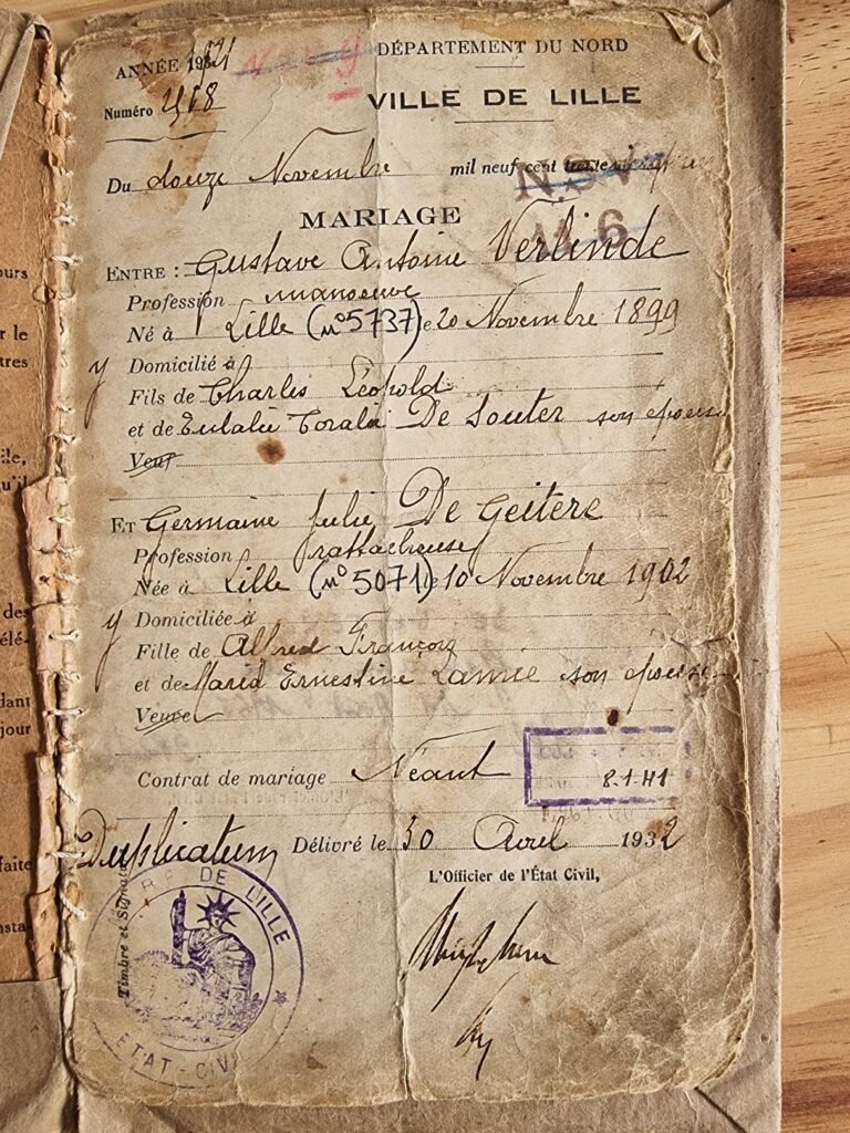 Gustave, 21 ans, est manoeuvre et habite 7 rue Magenta, cour sommerlinck à Lille. Sa mère Eulalie DE SOUTER, journalière, habitant Lille, est consentante par acte. Le marié déclare que pour son père, Charles VERLINDE, le décès et lieu de résidence sont inconnus. Germaine est rattacheuse, a 19 ans et habite 11 cité malfait, rue d’Aboukir à Lille. Ses parents Alfred DE GEITERE et Maria LAMIE, ménagère sont présents. Joseph DE GEITERE, fileur, domicilié 11 rue d’Aboukir à Lille est témoin, lui qui a été témoin à la naissance de la jeune mariée Germaine. Les parents de Germaine, les mariés et les témoins signent l’acte. A noter ici que sur signatures des nommés DE GEITERE, il n’y a pas de “E” à la fin.
