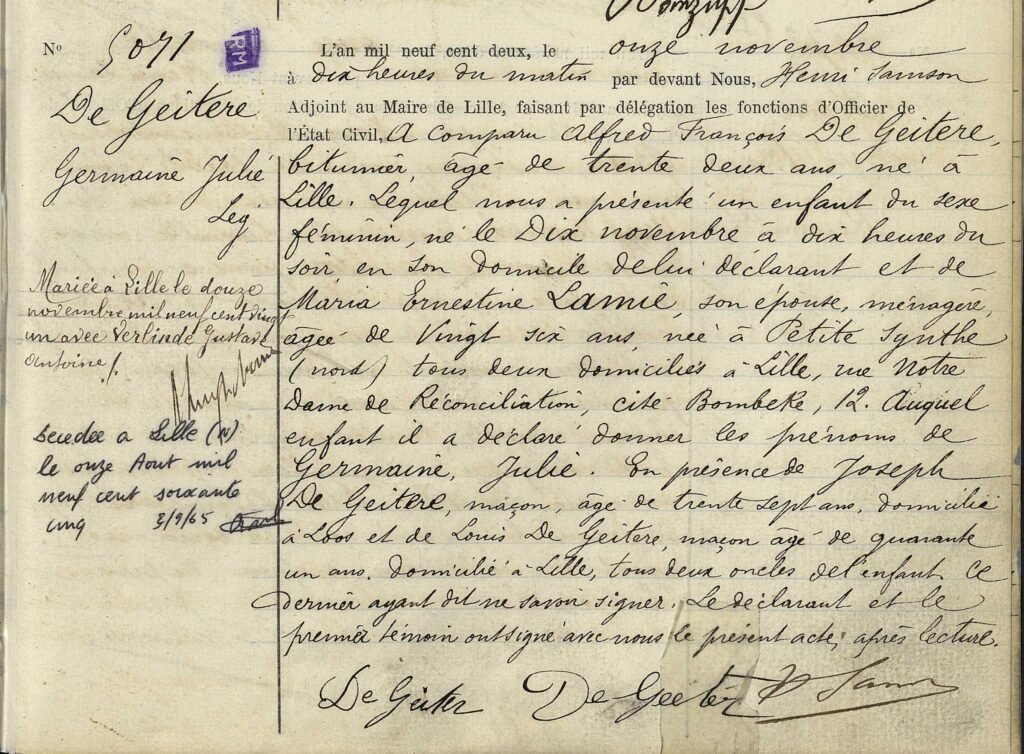 Ma grand-mère, Germaine Julie DE GEITERE est née le 10 novembre 1902 à Lille, 12 cité Bombeke, rue Notre-Dame de la reconciliation, à 22 heures.
