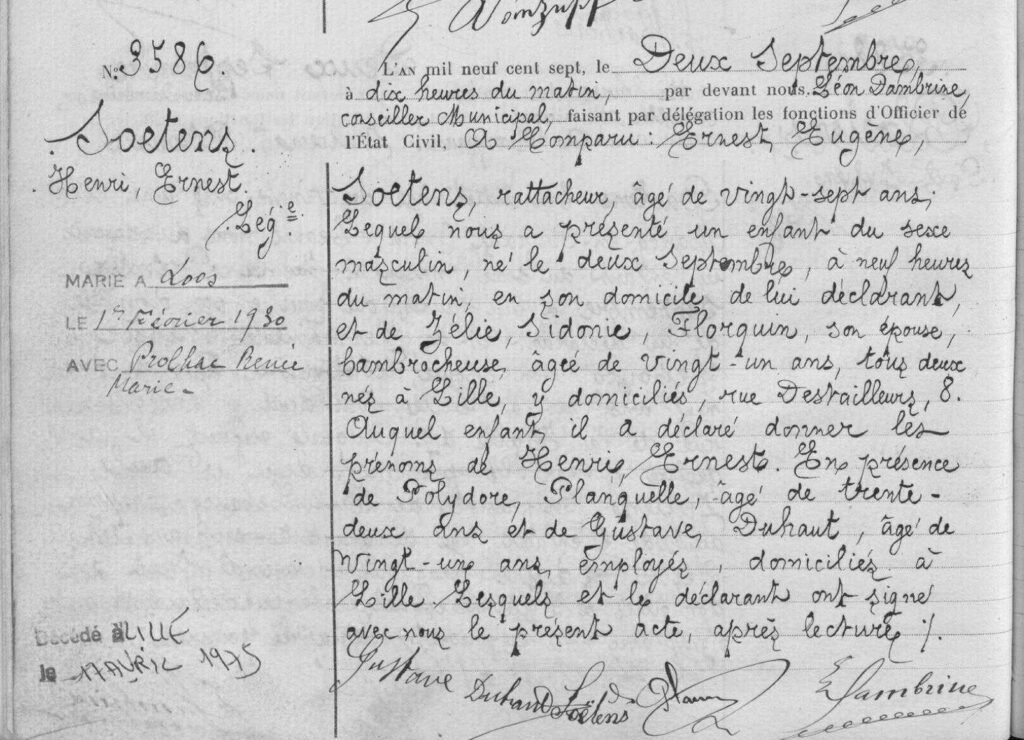 Mon grand-père HENRI SOETENS est né le 02 septembre 1907 à Lille, au domicile de ses parents 8 rue destailleurs.