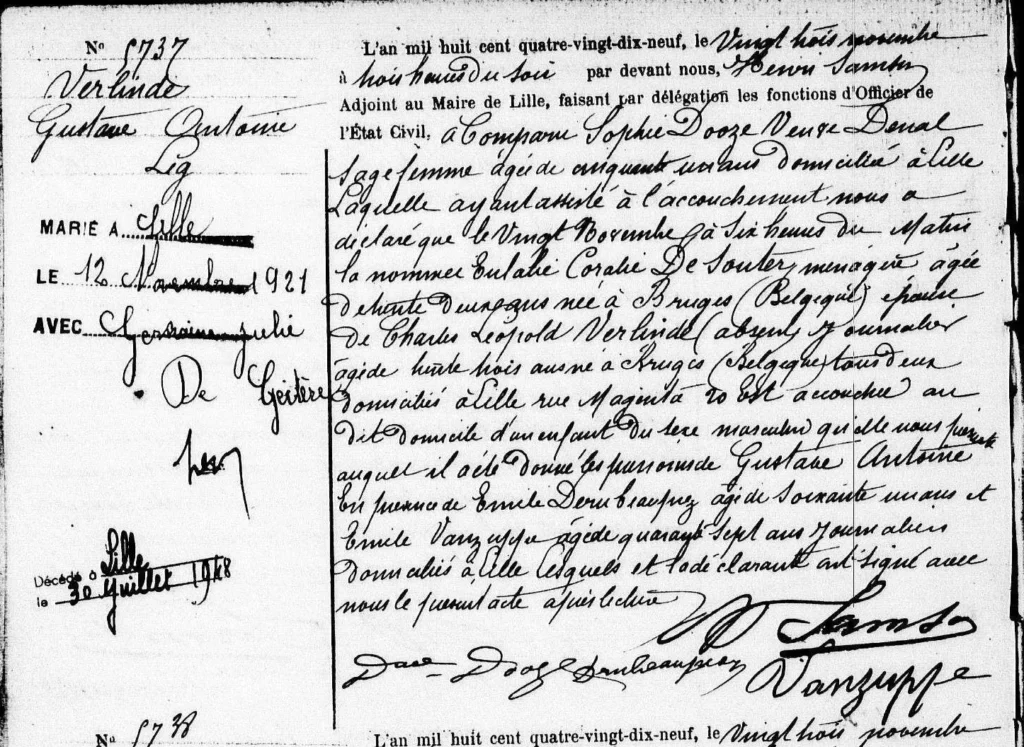 Mon grand-père, Gustave Antoine VERLINDE est né le 20 novembre 1899 au 20 rue Magenta à Lille à 6h du matin.
