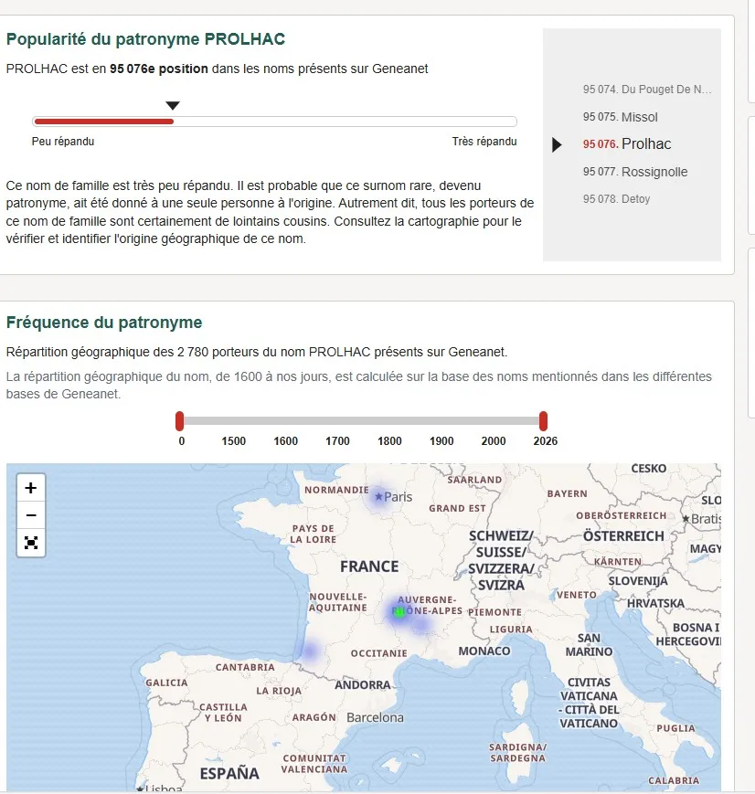 Prolhac : Porté notamment dans la Haute-Loire et le Cantal, désigne celui qui est originaire de Pralhac, village situé dans la commune de Loudes (43). Les mentions anciennes du lieu hésitent entre le a et le o (Proalhac en 1385, Prolhiacum en 1408, Pralhac sur la carte de Cassini).