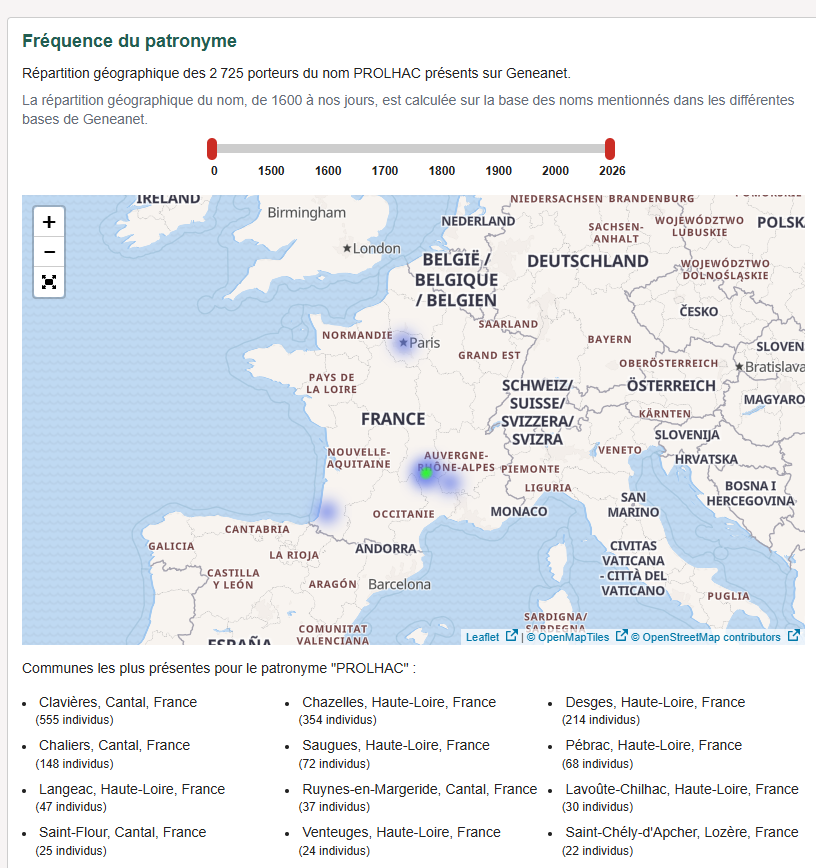Prolhac : Porté notamment dans la Haute-Loire et le Cantal, désigne celui qui est originaire de Pralhac, village situé dans la commune de Loudes (43). Les mentions anciennes du lieu hésitent entre le a et le o (Proalhac en 1385, Prolhiacum en 1408, Pralhac sur la carte de Cassini).