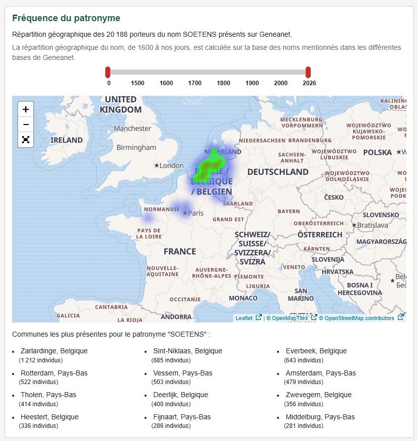 Soetens : Porté dans le Nord et en Belgique, c’est un double génitif qui correspond au néerlandais « zoet » (= doux), sans doute utilisé ici comme nom de personne (Debrabandere signale le nom féminin germanique Zwôtja), et qu’on retrouve dans les noms Soet, Soete. Il faut rattacher à la même racine les noms Soetaert, Soetaerts, Soetart, Soetemans, Soetement, Soetemondt, Soetemont, Soetinck. »