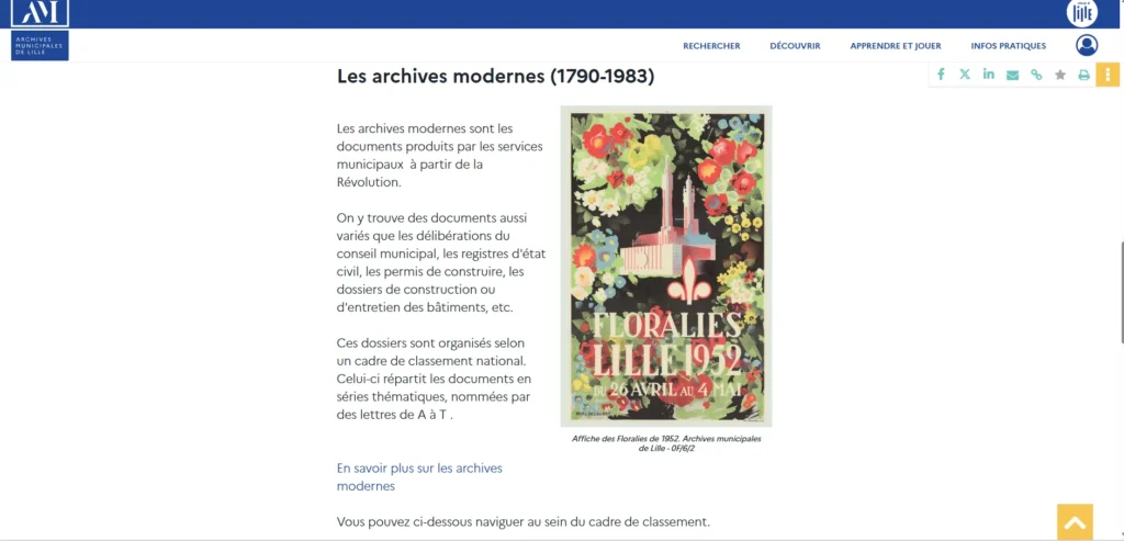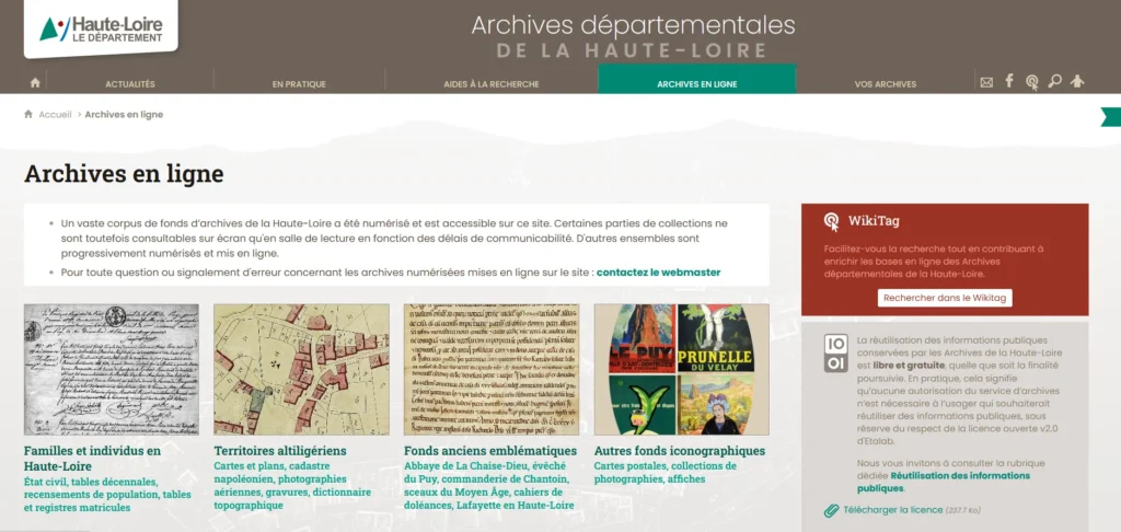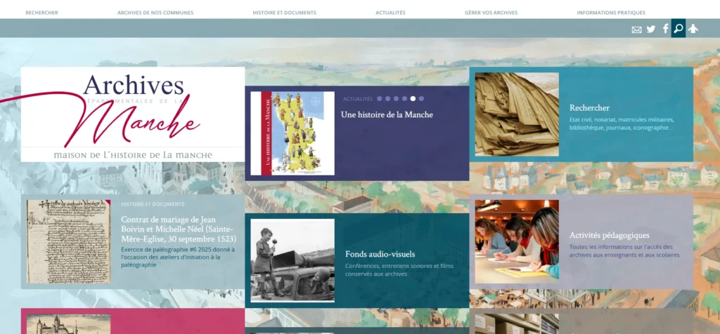 Un trésor ! Le site de la commune compléte le site des AD. En plus des archives de l’Etat-civil, vous y trouvez des anecdotes, des plans, l’histoire d’un quartier, d’un monument, des coutumes, des ateliers d’initiation. Chaque commune peut proposer des archives différentes bien sûr. Généralement, vous pouvez les contacter par mail si vous recherchez un acte précis et non disponible en ligne.